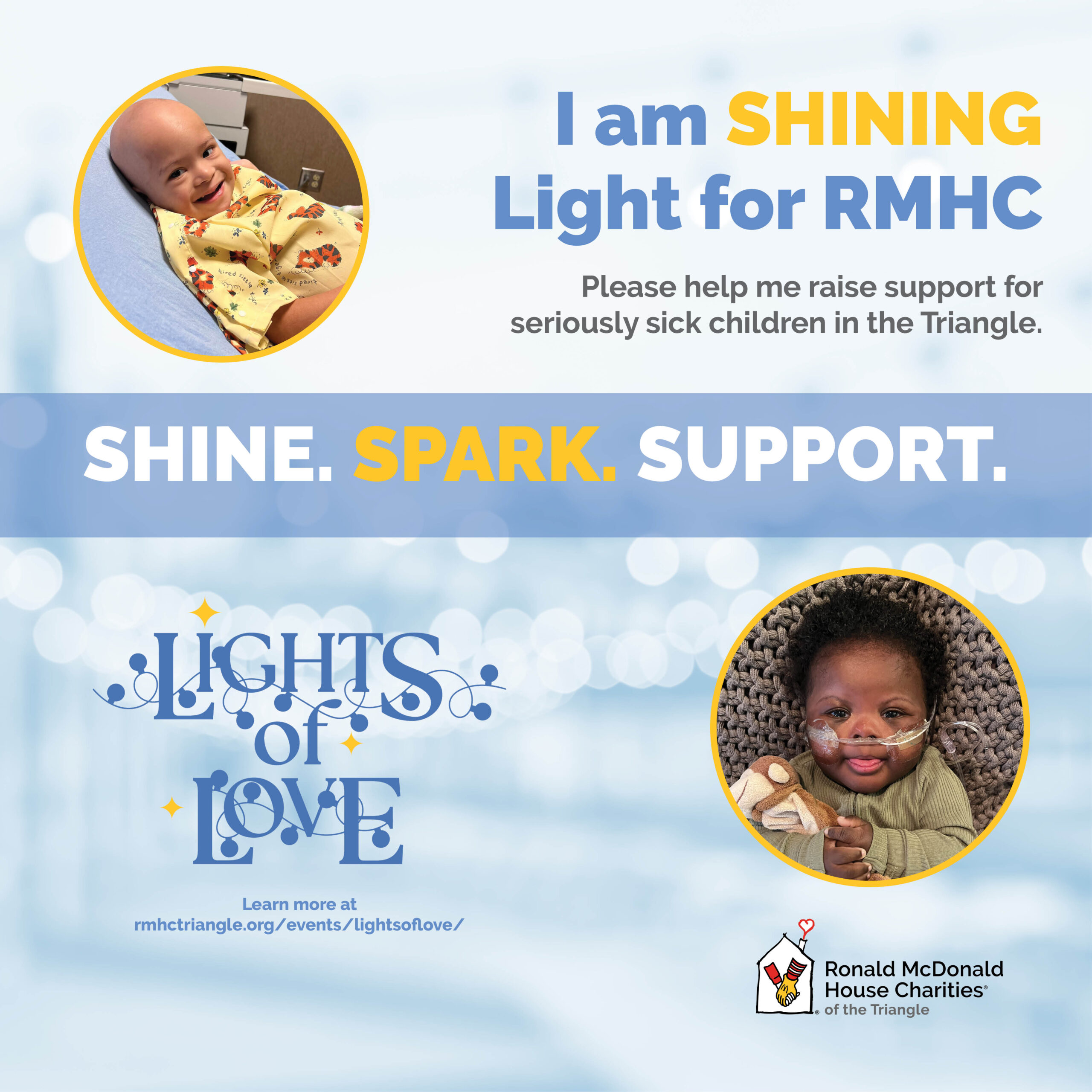 We’re so excited that you have chosen to SHINE for Ronald McDonald House by joining Lights of Love! This is a peer-to-peer fundraising campaign, so tell people in your sphere why you support Ronald McDonald House and ask them to help support, too. One great way to get your friends and family involved and supporting you is through your own social media. We’ve pulled together a few resources to make this simple for you.